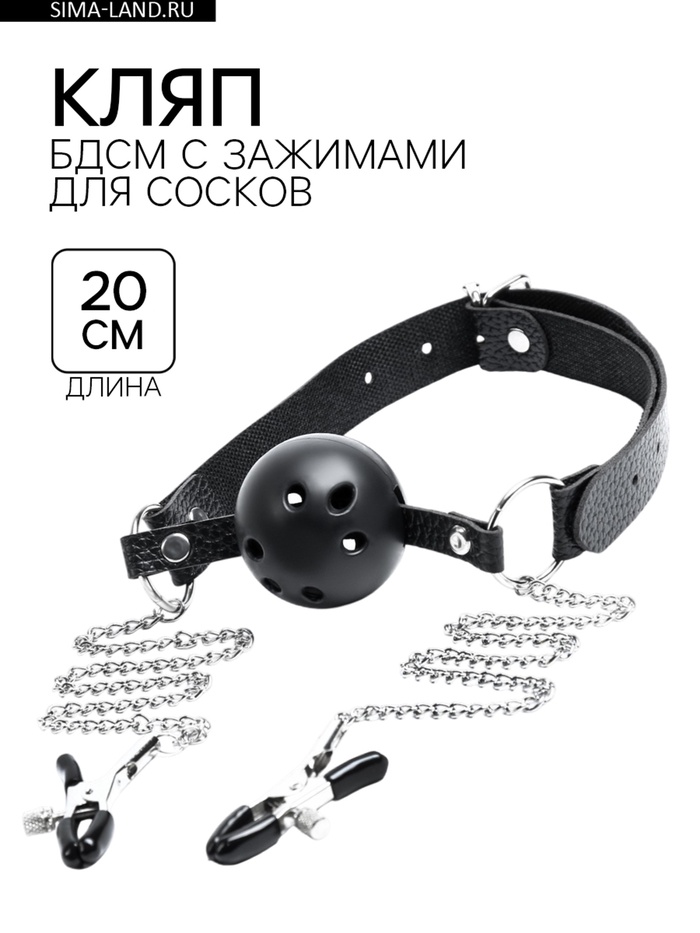 Кляп с зажимами для сосков. Выполнен из эко-кожи и abs пластика. Шарик имеет оптимальный размер, хорошо помещается в рот, а ремешок имеет систему регулировки, так что он подойдет и для нее и для него. Имеет длинную цепь и зажимы. Перед использованием необходимо помыть игрушку под проточной водой, далее обработать специальным спреем -клинером.