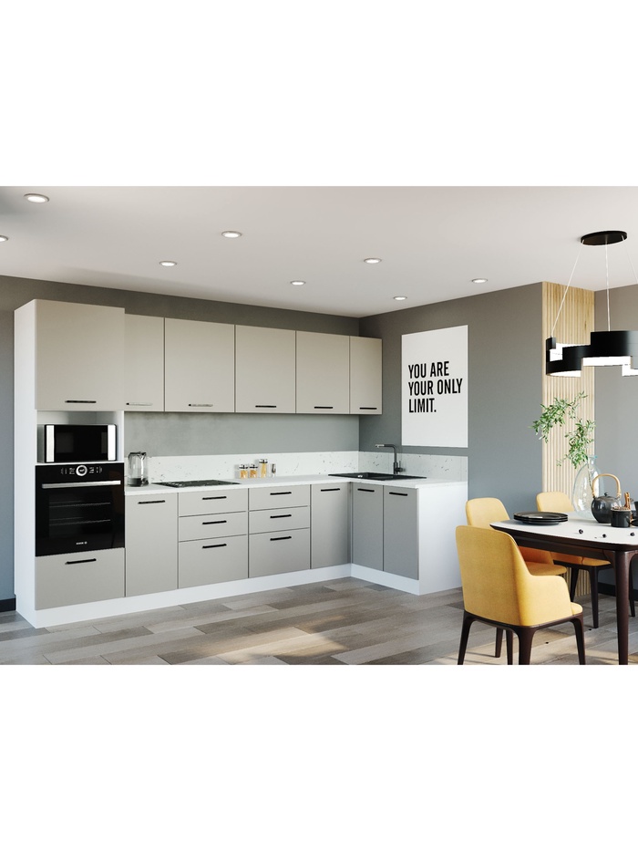 Утонченный дизайн: фасады цвета сатин создают мягкую, спокойную атмосферу и визуально расширяют пространство. Столешница «мрамор марквина белый» с ее благородными прожилками привносит в интерьер нотки элегантности и природной гармонии.- Качество и практичность: корпус и фасады из гарантируют надежность и долговечность эксплуатации. Столешница толщиной с цельной поверхностью обеспечивает удобство в уходе и гигиеничность — никаких стыков и скопления грязи. Комфортное использование: Все выдвижные элементы оснащены шариковыми направляющими с доводчиками — система обеспечивает мягкое, плавное и абсолютно бесшумное закрывание ящиков, делая использование кухни максимально приятным.
