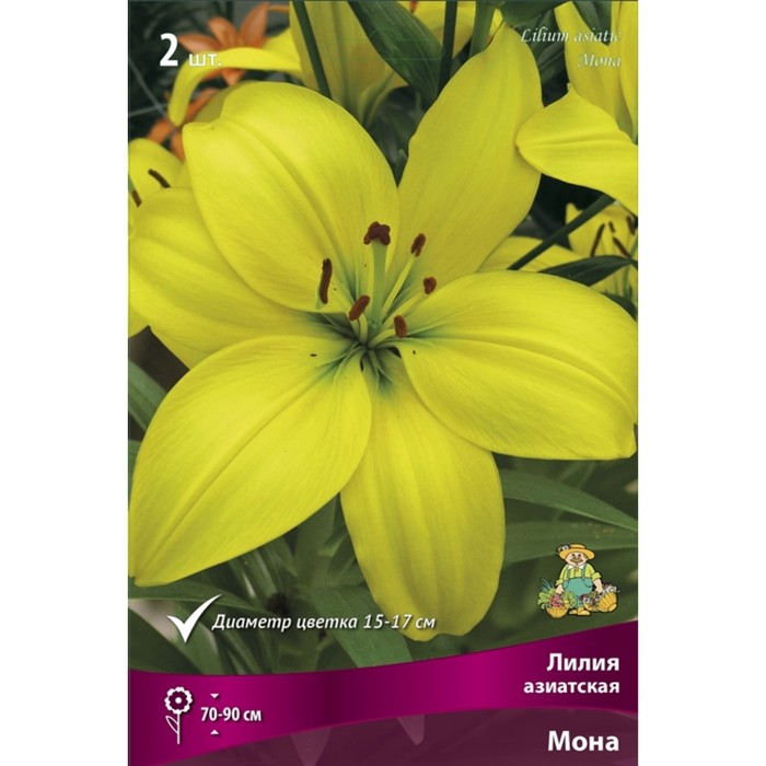 Лилии - многолетние луковичные растения. Высота у разных видов от 30 до 200 см. Есть сорта для выращивания в горшках.Азиатские гибриды – Неприхотливые, выносливые растения, отличаются морозостойкостью, быстро и легко размножаются. Цветки разнообразны по форме и окраске. Цветут во второй половине июня-июле. Пригодны для выгонки во внесезонное время. Аромат отсутствует. Зимостойкость хорошая.Мона - высота растения 95 см. Цветок ярко-желтый с оранжевыми пыльниками, диаметр цветка 17 см. Месторасположение: Предпочитают солнечные или слегка затенённые места.Почва: любая хорошо дренированная почва, богатая питательными веществами, рыхлая, песчано-глинистая, известкованная.Посадка: Срок осенней посадки - август-сентябрь, весенней – конец апреля-май. Глубина посадки – 10-15 см. На одном месте могут расти от 3 до 5 лет.Уход за растениями заключается в поддержании почвы во влажном, рыхлом состоянии, проведении подкормок. Хорошо замульчировать посадки. Большинство видов лилий не требует выкопки на зиму.Использование: в групповых посадках, миксбордерах, клумбах, на срезку.