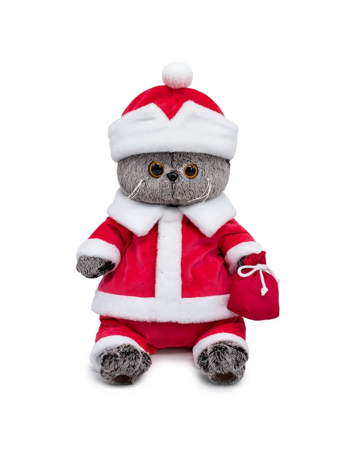 Мягкая игрушка «Басик Кот Мороз» — это яркий новогодний персонаж, который мгновенно создаёт праздничное настроение. Басик одет в красный костюм с белой отделкой, пушистую шапочку и держит в лапке маленький мешочек, словно готов дарить подарки. Серый плюш мягкий и приятный на ощупь, игрушку приятно обнимать и ставить под ёлку. Благодаря выразительным глазам и продуманным деталям образ получается атмосферным, уютным и идеально подходящим для зимнего подарка.