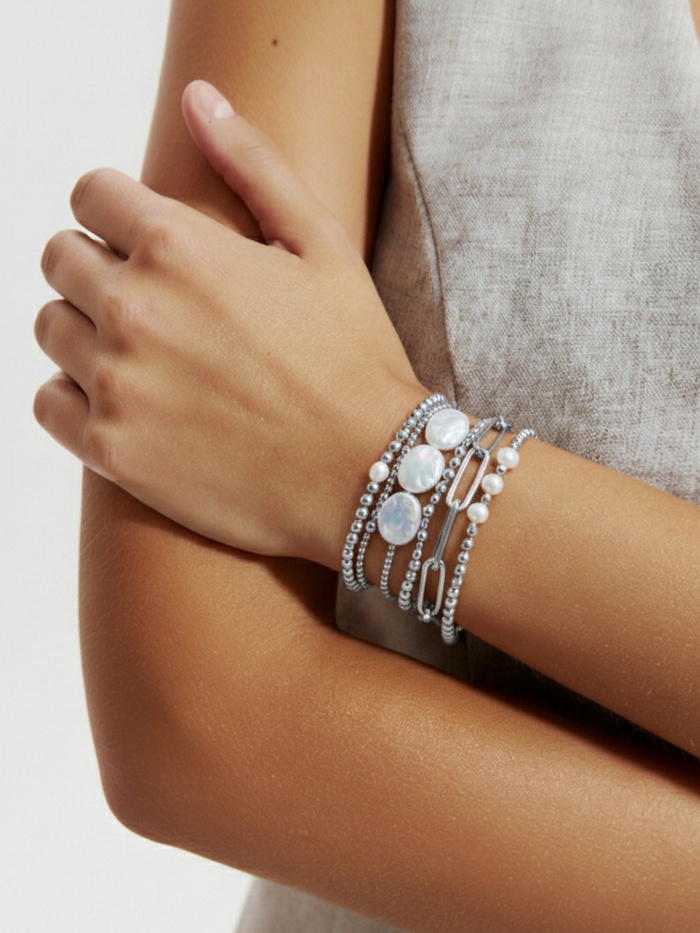 Создавайте уникальный стиль с легкостью! Набор из 7 пластиковых браслетов. Ощутите прелесть разнообразия форм и материалов, собранных в одном комплекте. Перед вами 7 браслетов из бусин, подчеркивающих ваш вкус и чувство прекрасного, дополненных одним классическим браслетом цепочкой из металла. Комплект выполнен в серебряной цветовой палитре, придавая образу нотку роскоши и легкости одновременно.