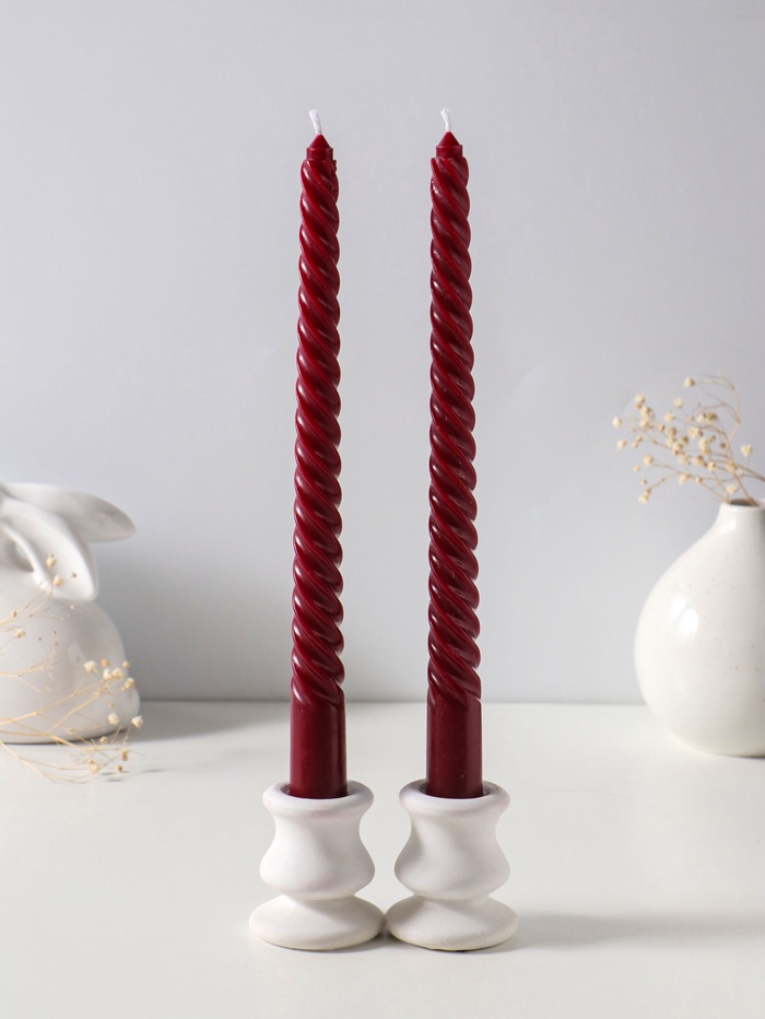 Этот набор из двух высоких витых свечей создаёт атмосферу уюта и спокойного торжества. Длинные, изящные свечи горят ровно и долго, их пламя мерцает в такт лёгкому движению воздуха. Бордовый оттенок придаёт обстановке глубину и благородство, делая декор завершённым без лишней вычурности.