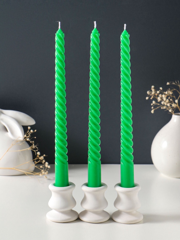 - Три витые свечи высотой 25 см в спокойном зелёном цвете.