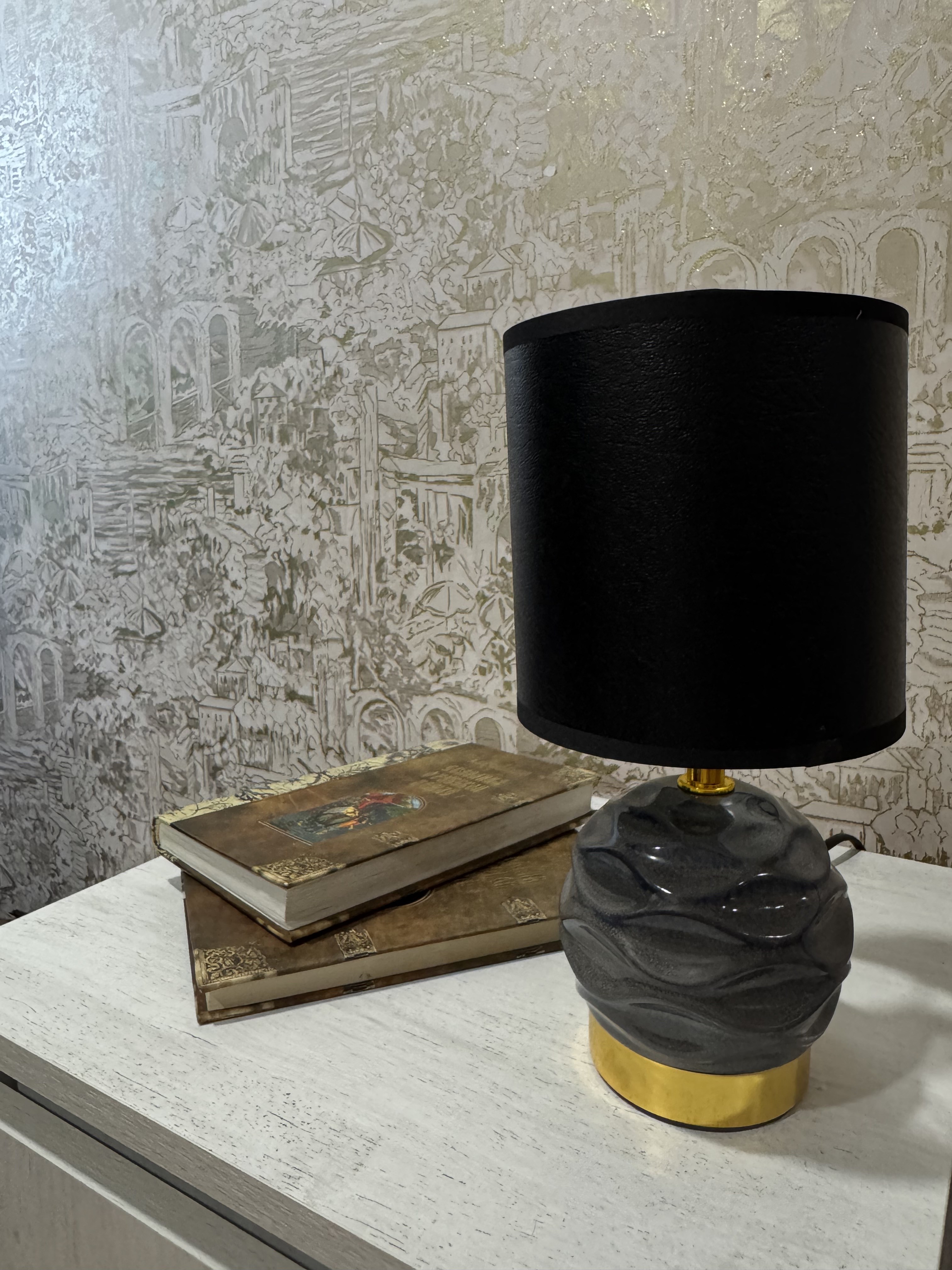 - Цилиндрический текстильный абажур из тёмных тонов обеспечивает мягкое и комфортное освещение.
