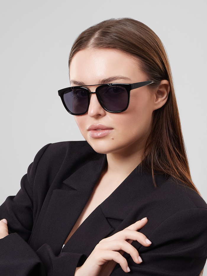Чёрные линзы в форме «авиаторов» придают этому аксессуару классический и одновременно современный вид. Полноободковая пластиковая оправа обеспечивает прочность и лёгкость, а отсутствие градиента делает линзы универсальными для любых условий освещения. Эти очки не только стильно выглядят, но и защищают ваши глаза от вредного ультрафиолетового излучения UV 400, что особенно важно для здоровья глаз.
