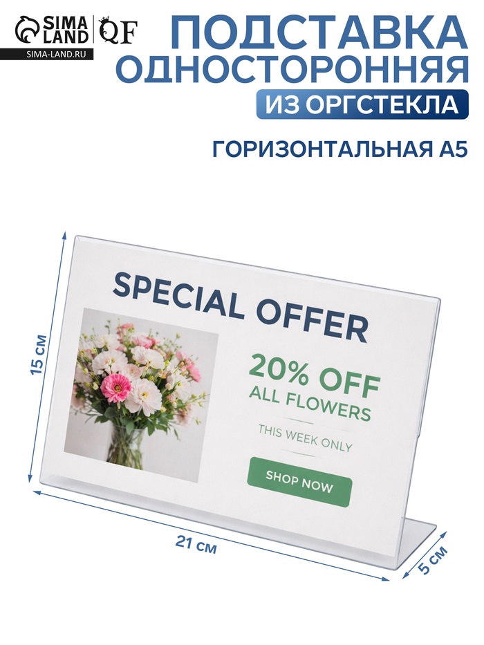 Вертикальная подставка формата А5 идеально подходит для размещения рекламных материалов и документов. Её размеры 21×5×15 см делают её удобной для использования в офисах, на ресепшенах и в магазинах. Отличается стильным и элегантным дизайном. Подставки из оргстекла (листовой акрила). Благодаря использованию 100% акрила, подставки имеют идеальную прозрачность, высочайший блеск и шикарный внешний вид. ВНИМАНИЕ: Изделия поставляются в матовой защитной плёнке, белого, синего, зелёного или прозрачного цвета, которую необходимо удалить перед оценкой качества или перед использованием.