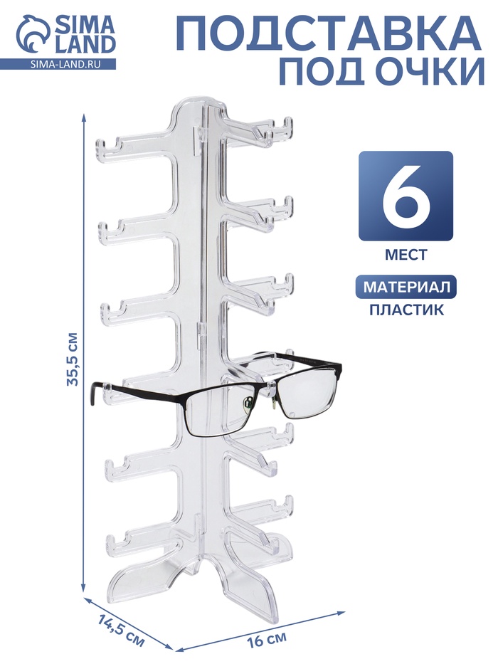 Компактная подставка под очки на 6 мест идеально подходит для аккуратного хранения и демонстрации. Габариты 16×14,5×35,5 см делают её удобной для использования на прилавках магазинов или в домашних условиях. Прозрачный цвет и минималистичный дизайн подчёркивают стиль аксессуаров. Подставка надёжно удерживает очки, предотвращая их повреждение. Практичное и стильное решение для демонстрации очков.
