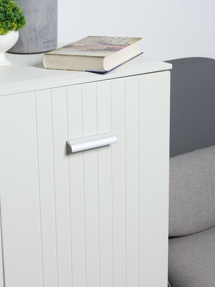 Ручка устанавливается на фасадах ящиков тумб или комодов. Крепится к поверхности мебели с помощью двух винтов. Модель выполнена из прочного алюминия и имеет серебристый цвет.