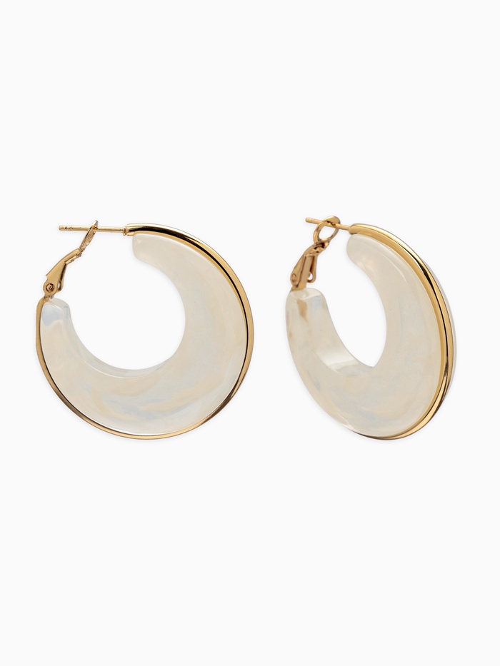 Станьте центром внимания с элегантными и современными серьгами-кольцами из полистоуна, окрашенными в нежный молочно-белый цвет и окаймлёнными приятным золотистым металлом. Небольшие и скромные, они представляют собой настоящий тренд сезона, гармонично сочетающийся с разными стилями и создаваемый руками талантливых дизайнеров.