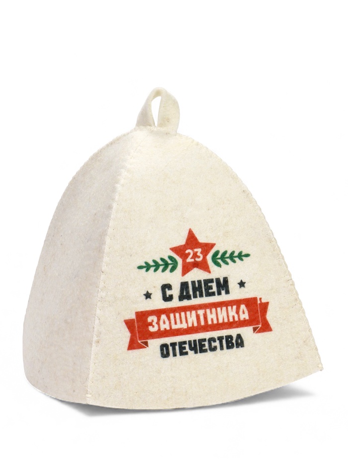 Банная шапка «С Днём защитника Отечества» из шерсти и полиэфира — тематический аксессуар для парной. Она создаёт барьер от перегрева, увеличивая время комфортного пребывания в жаркой атмосфере бани или сауны.