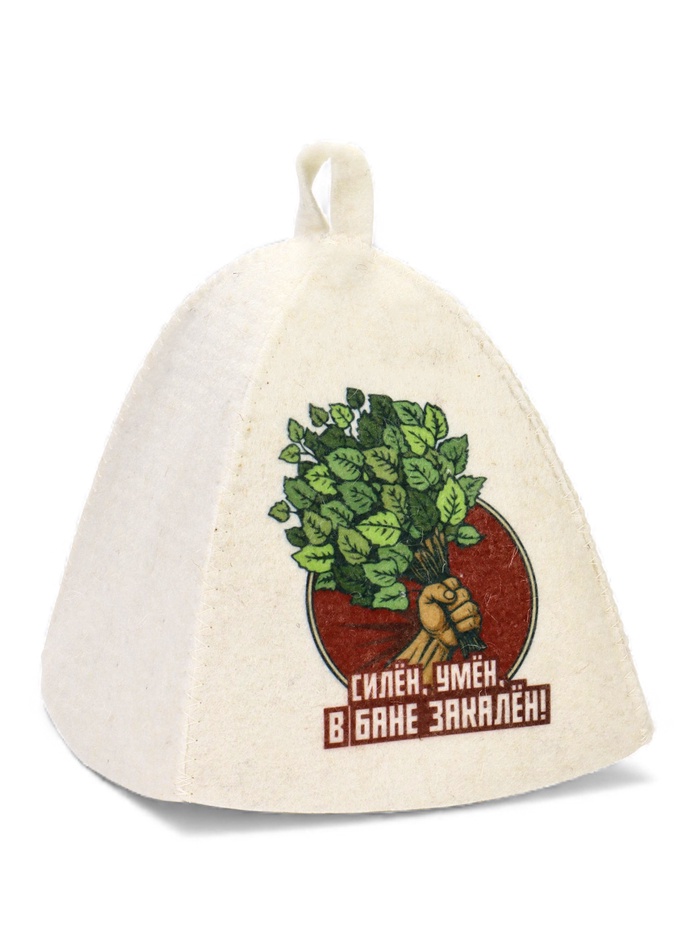 10952613 Шапка для бани с принтом "Силён, умён, в бане закалён", белая