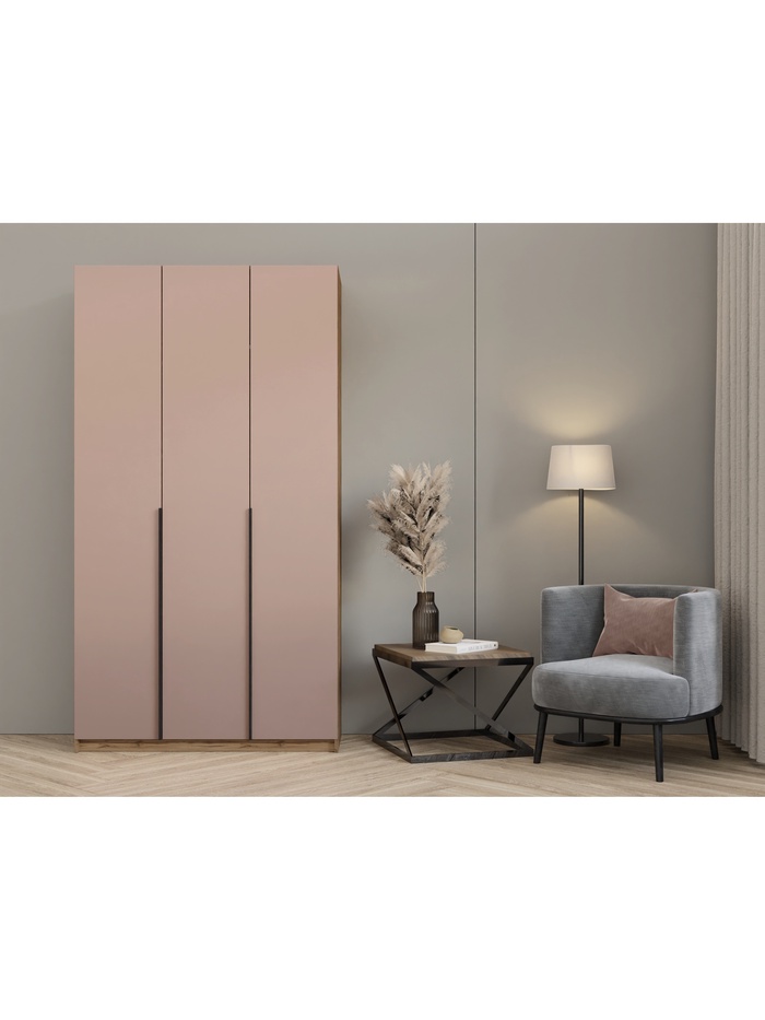 Вместительный и элегантный шкаф для спальни, гостиной или прихожей. Модель выполнена в нежном сочетании оттенков: тёплая текстура дуба вотан и мягкая пудра создают утончённый и романтичный образ, придающий мебели современный шарм.
